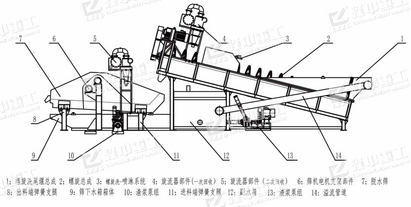 螺旋洗砂裝置,溢流裝置、反水裝置,尾礦干排裝置,分離回收裝置,儲(chǔ)水槽,水泵,電機(jī),減速機(jī)。