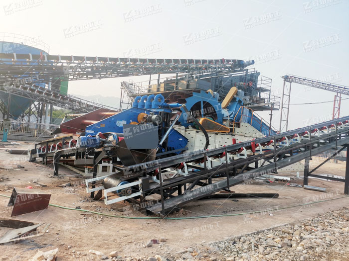 工作流程:物料人工砂或天 然砂,經(jīng)由皮帶機(jī)給料至篩分裝置,篩上物料作為成品由皮帶機(jī)輸送至堆場(chǎng),篩下物則通過(guò)流槽進(jìn)入洗砂裝置,并在洗砂裝置中進(jìn)行充分浸泡、攪拌、清洗,清洗過(guò)的物料再運(yùn)送到前端脫水設(shè)備中時(shí)行脫水、回收,產(chǎn)出合格的成品砂。