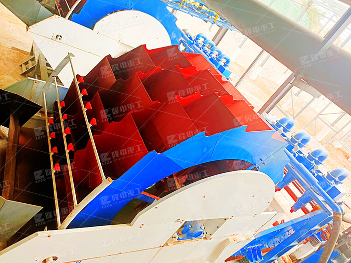 當(dāng)電動(dòng)機(jī)、減速機(jī)啟動(dòng)后,減速機(jī)可驅(qū)動(dòng)水槽中的葉輪不停的在水槽中作圓周運(yùn)動(dòng),水槽中的砂石或者石粉經(jīng)過(guò)葉輪的的攪拌、翻轉(zhuǎn),被葉輪帶到高處脫水后排入出料槽進(jìn)行后續(xù)烘干等操作,可得到我們需要的符合標(biāo)準(zhǔn)的砂石產(chǎn)品。