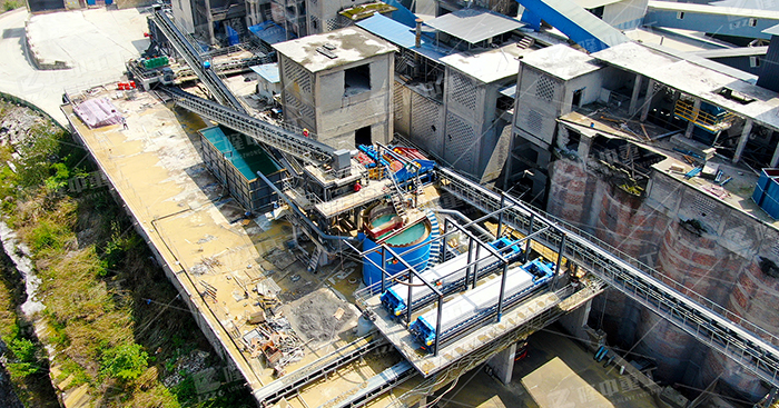 原料先經(jīng)過破碎機進行處理,之后采用的擦洗一體機可除去砂石黏土、黏泥塊,對物料進行水洗篩分;通過細沙回收裝置,使細砂得到充分回收。后端污水進到濃密灌以后、進行初步分離——泥漿下沉,清水通過溢流槽流出,經(jīng)管道重新返回清水池,進行循環(huán)利用。